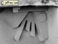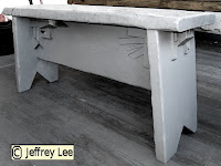 After I rebuilt my front steps I had a number of old treads left over. So I built two benches out of them, carved them here and there for a rustic look and filled the several crannies with odds and ends…then caulked and painted. Followings is a shot of one bench ( the other is in the same style, but longer ) and then details of the “odds and ends”.