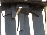 After I rebuilt my front steps I had a number of old treads left over. So I built two benches out of them, carved them here and there for a rustic look and filled the several crannies with odds and ends…then caulked and painted. Followings is a shot of one bench ( the other is in the same style, but longer ) and then details of the “odds and ends”.