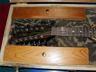 I used the smallest guitar tuners I could find, but there are 12 of ’em and they do throw off the balance of the instrument, the body being so light. The case is maybe overkill…it is plywood all around. A cavity for the gourd-back was formed with the spray-foam “Great Stuff” and at Joann’s Fabrics I found a liner that is somewhat thistle-like. The instrument is flanked by two compartments which store strings and original unused parts.