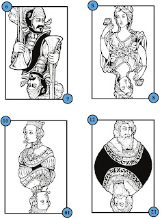 Way back when, my buddy Dave devised a card game…it was based on the number of cards in a Tarot deck and involved the use of polyhedral dice. He asked me to make illustrations for the face cards. Somehow, he managed to persuade the Avalon Hill Game Company of Baltimore, Maryland to publish the game, which is called OD. We were quite thrilled, since some of our favorite war games were published by Avalon Hill.